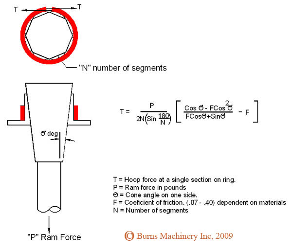 | Determining required ram tonnage: The formula below can be used to estimate the tonnage necessary for a sizer application. It is critical to have the required hoop force required at a single cross section of the ring. The value of "F" is a function of material coatings on the sliding components of the machinery. A high quality machine has a 0.10 for F. A typical angle φ is 5 degrees.